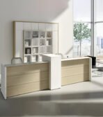 The UGR-007 reception table is a modern, professional solution for creating impactful first impressions. Crafted from high-quality Pre-Laminated Particle Board, it offers a minimalist design with a light wood finish and a central elevated counter for guest interaction.