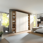 WARDROBE-001 is a sleek and functional modular wardrobe, perfect for modern bedrooms. Featuring sliding doors and open shelves on both ends, this unit is designed to maximize storage while maintaining a clean, contemporary look.